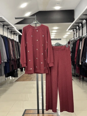 ÖNÜ KAR TANESİ DESENLİ SİMLİ TRİKO PANTOLONLU TAKIM - Bordo