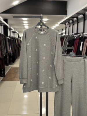 ÖNÜ KAR TANESİ DESENLİ SİMLİ TRİKO PANTOLONLU TAKIM - Gri