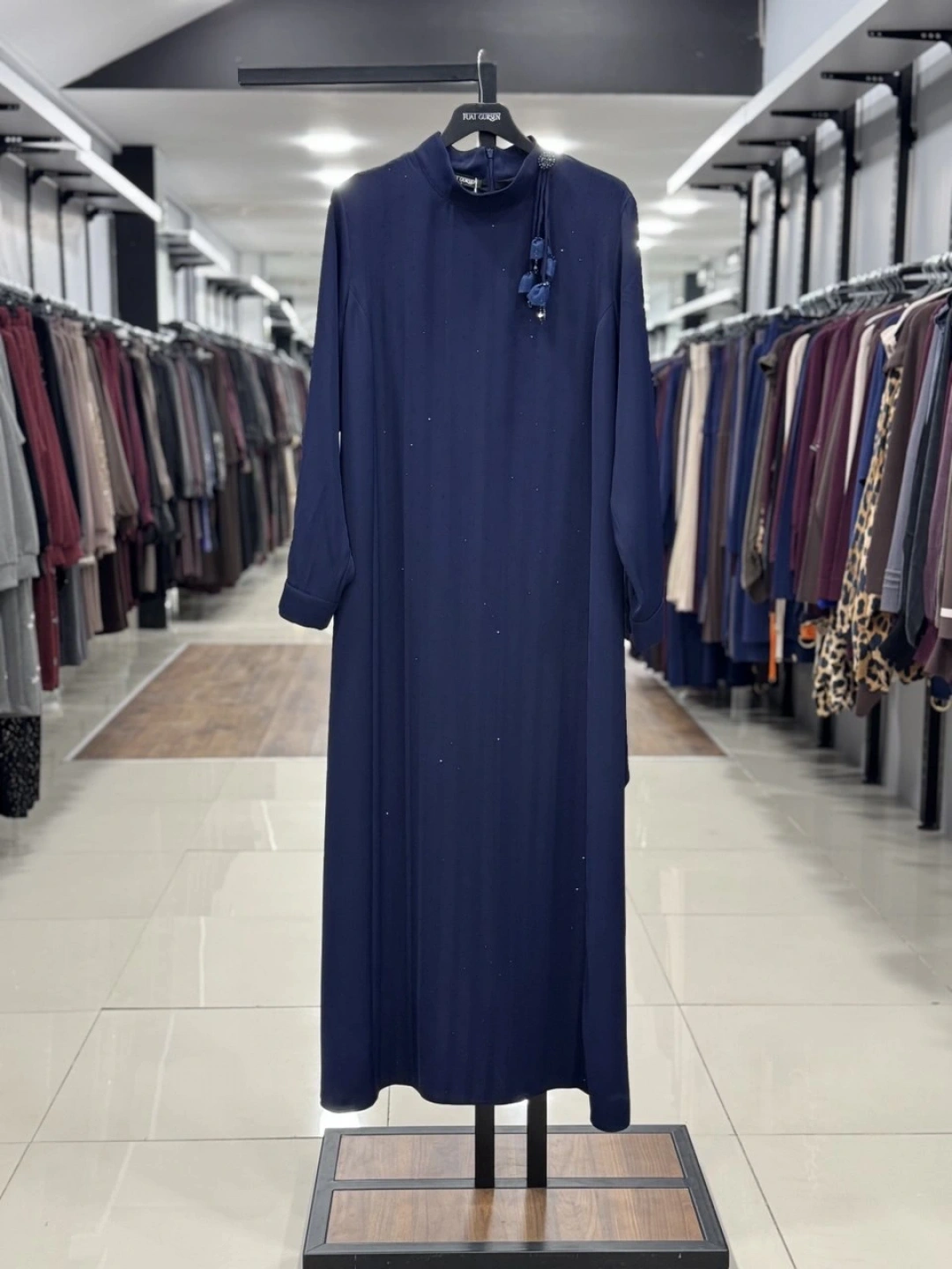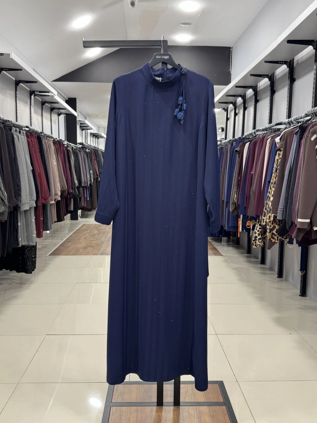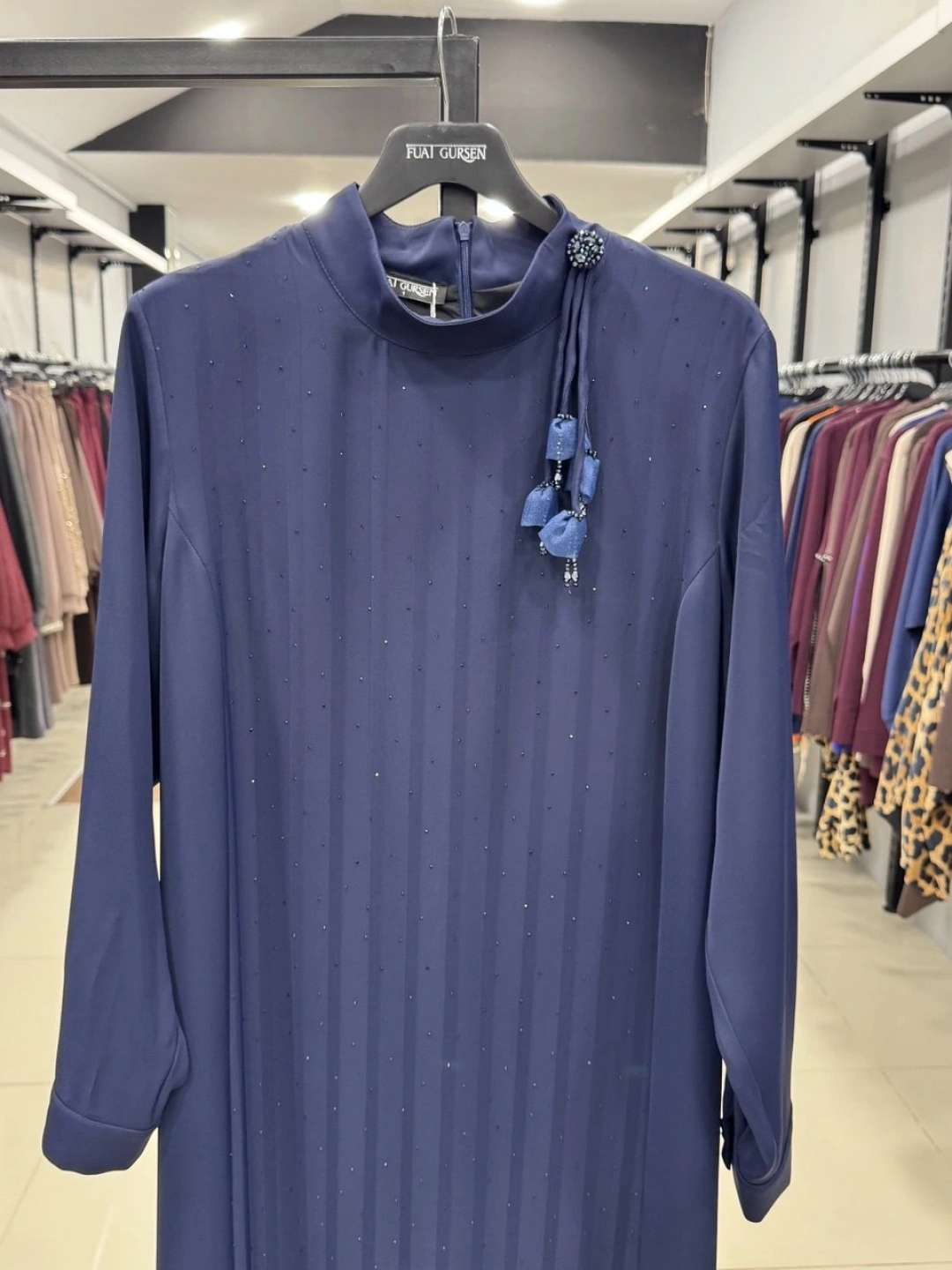 BELDEN KEMERLİ BOYNU AKSESUARLI ELBİSE - Lacivert