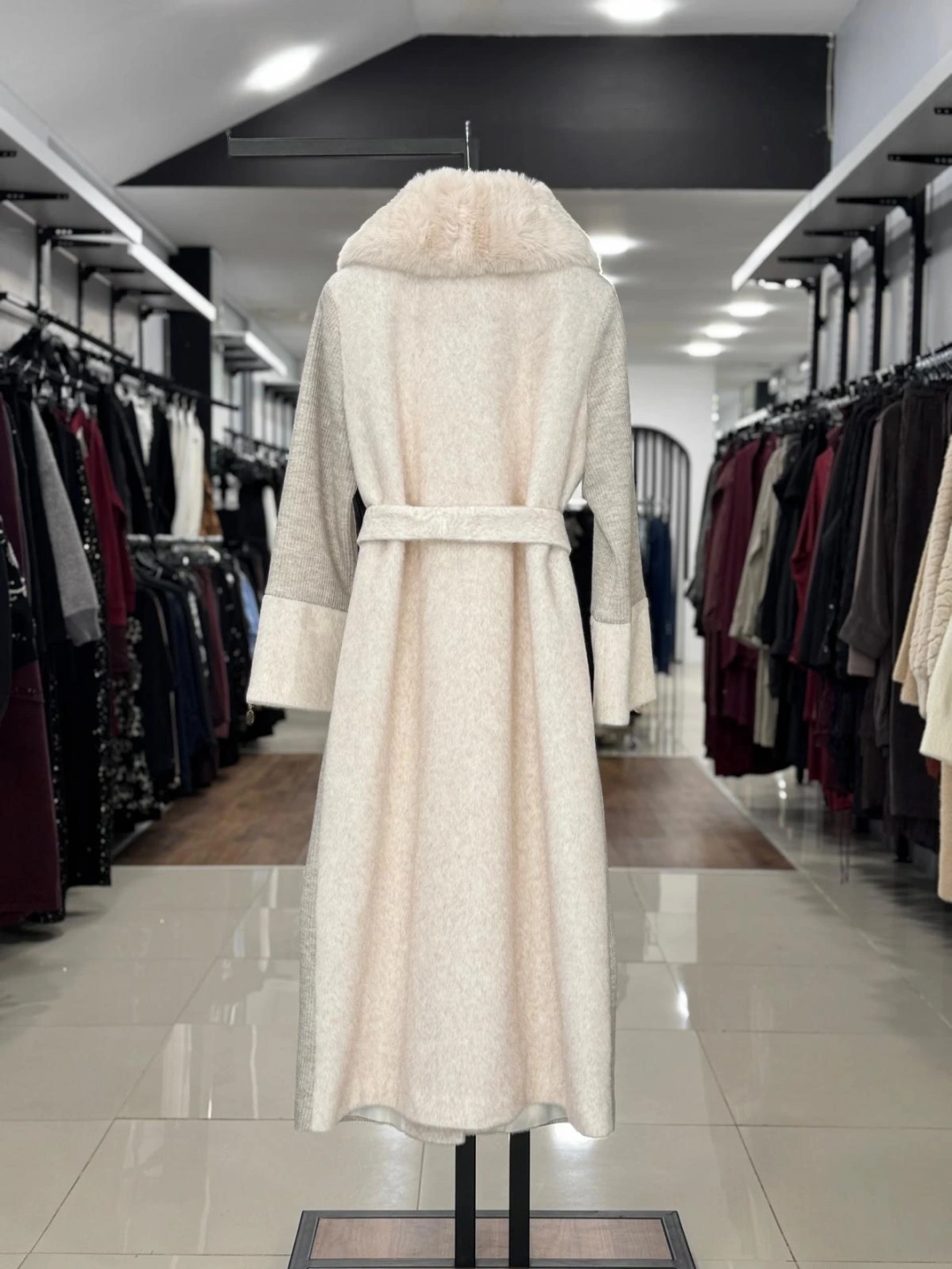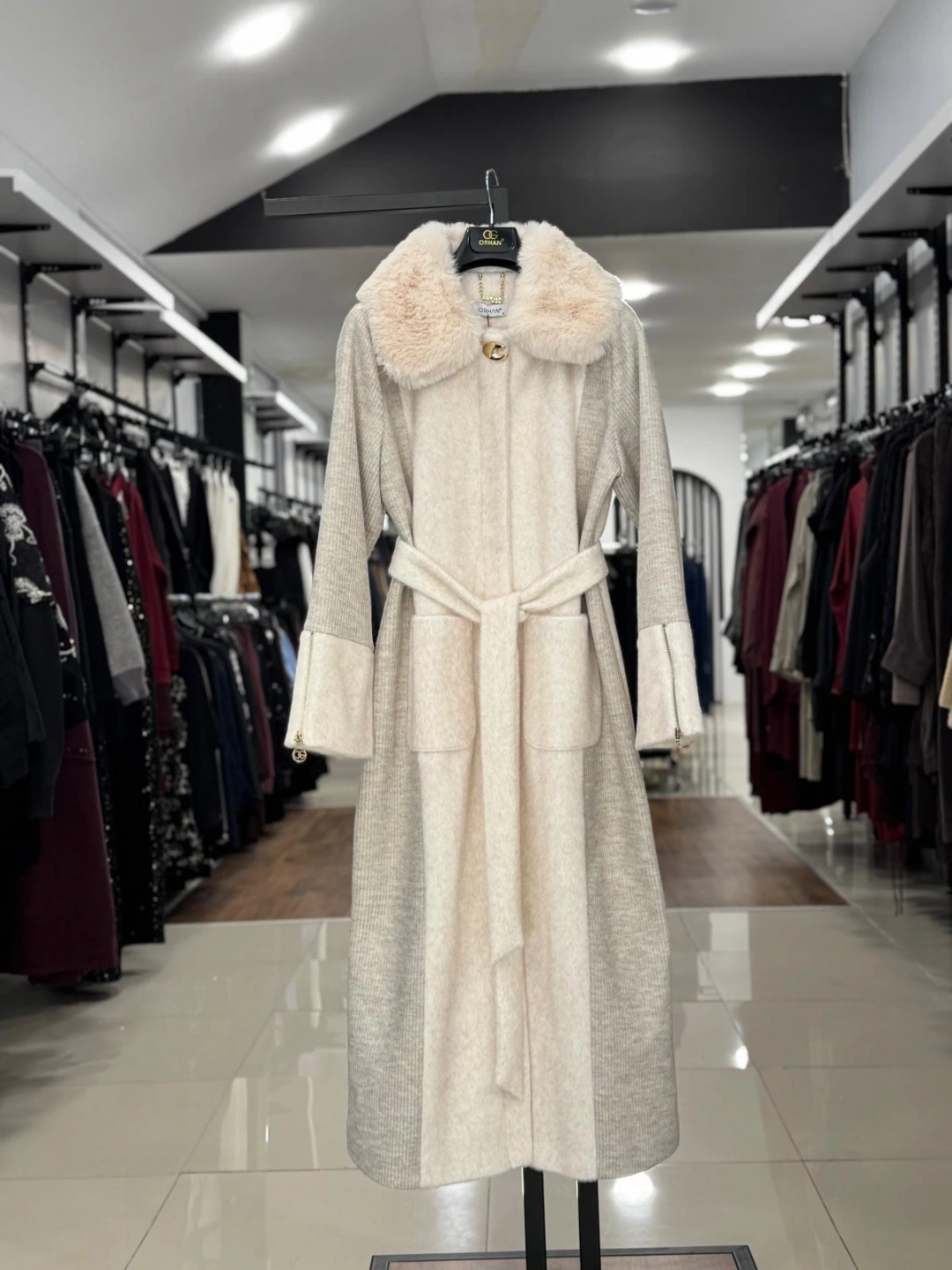 KÜRK DETAYLI KEMERLİ KABAN - Ekru