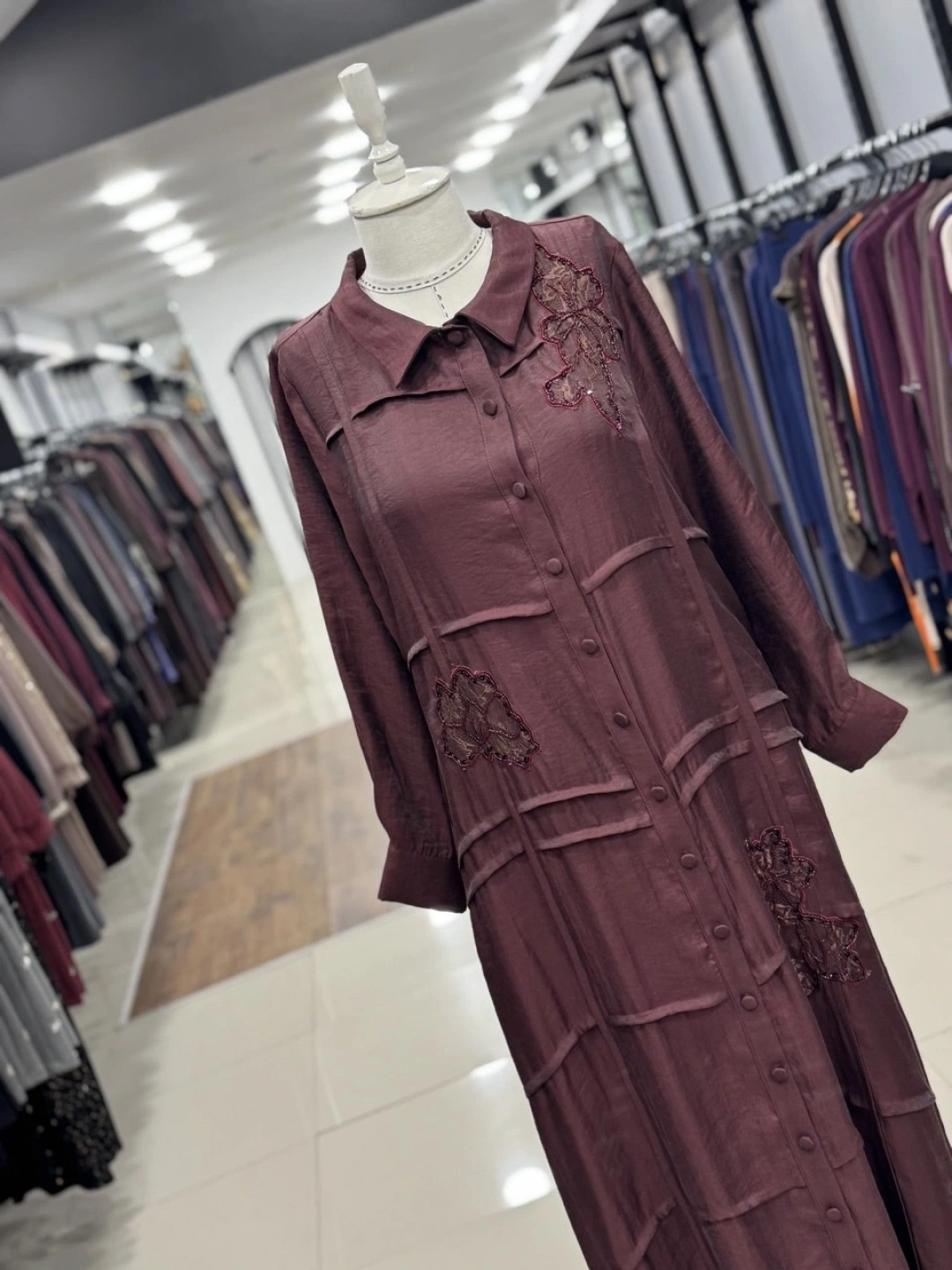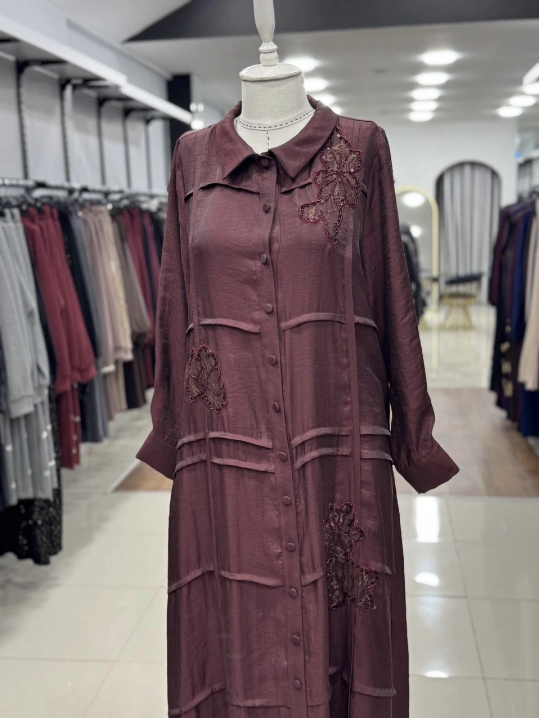 ÖNÜ BONCUK ÇİÇEK DESEN İŞLEMELİ ELBİSE - Kahverengi