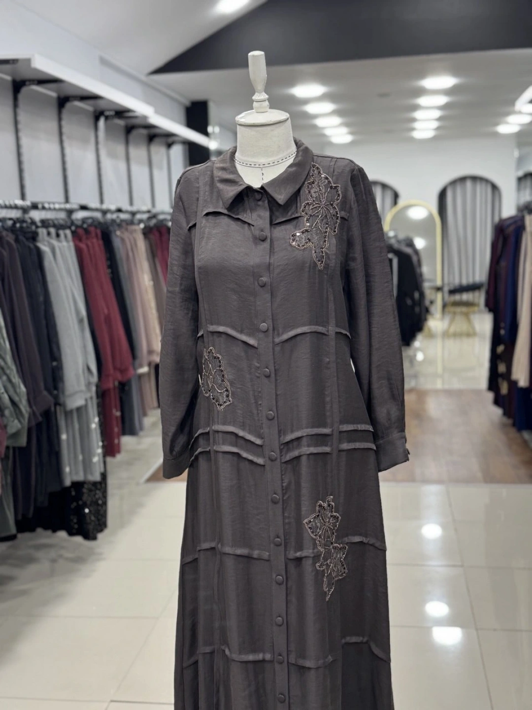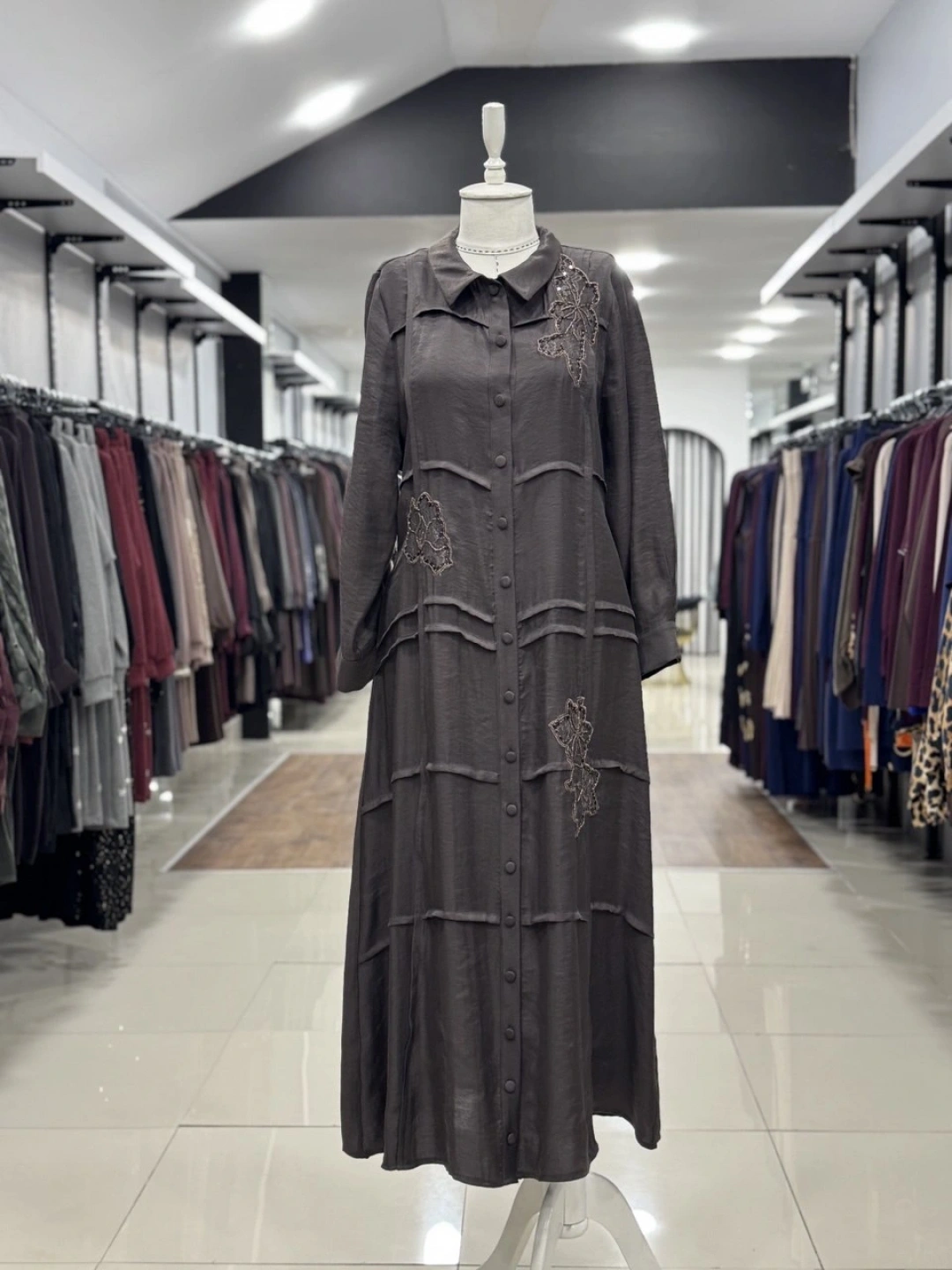 ÖNÜ BONCUK ÇİÇEK DESEN İŞLEMELİ ELBİSE - Kahverengi