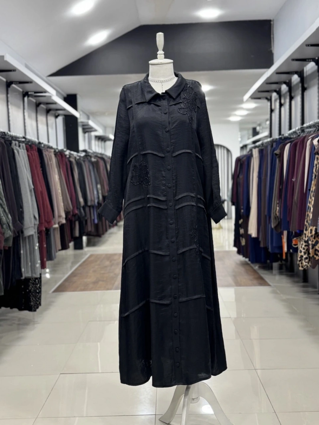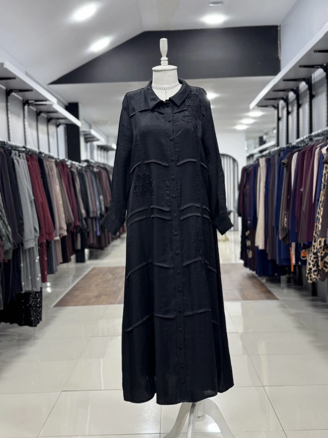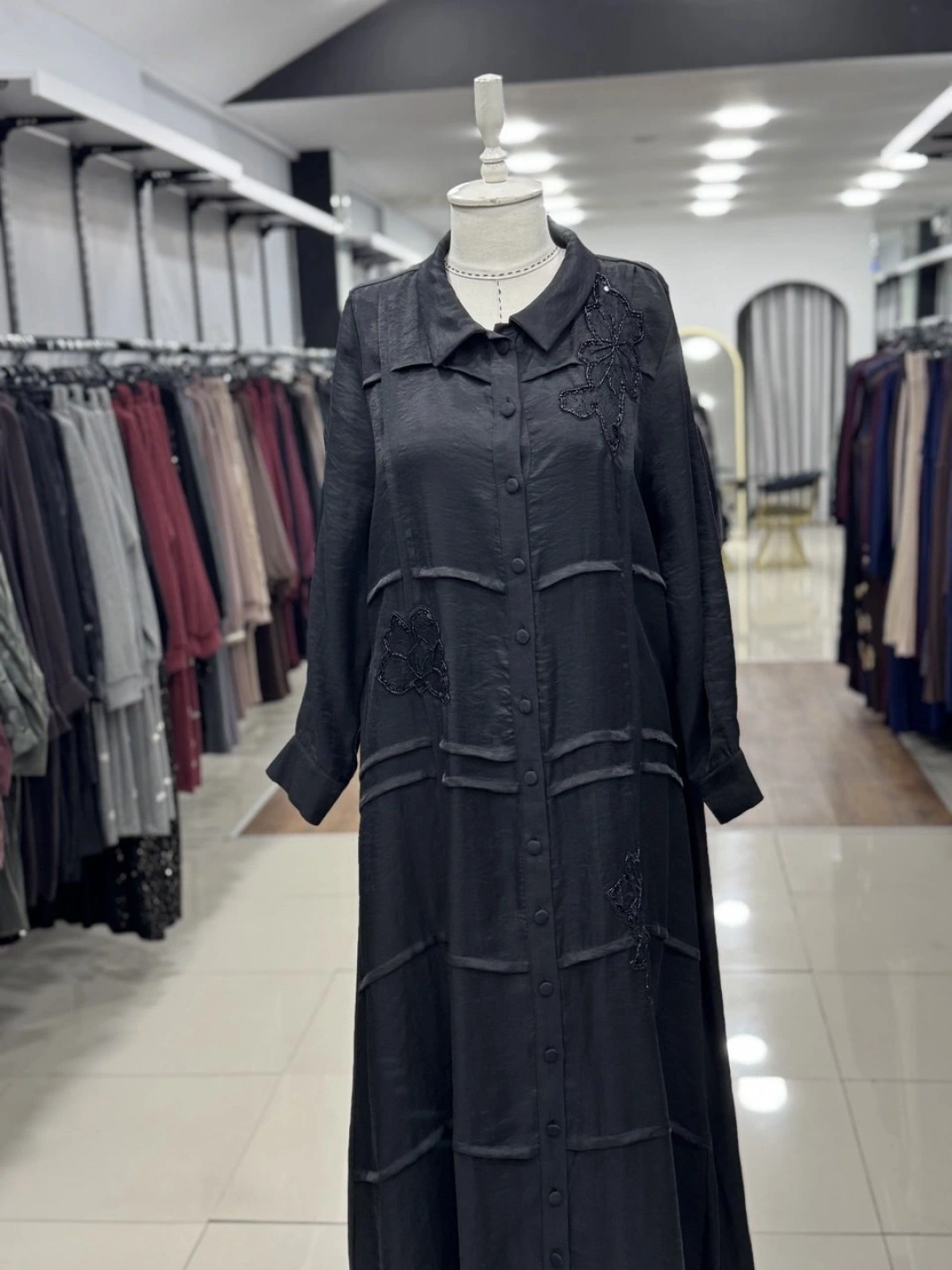 ÖNÜ BONCUK ÇİÇEK DESEN İŞLEMELİ ELBİSE - Siyah