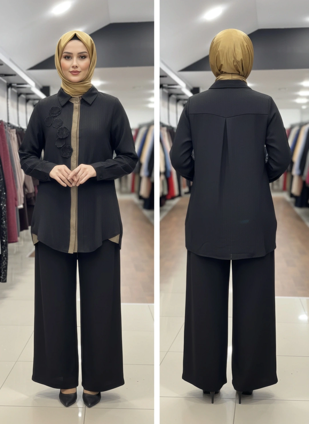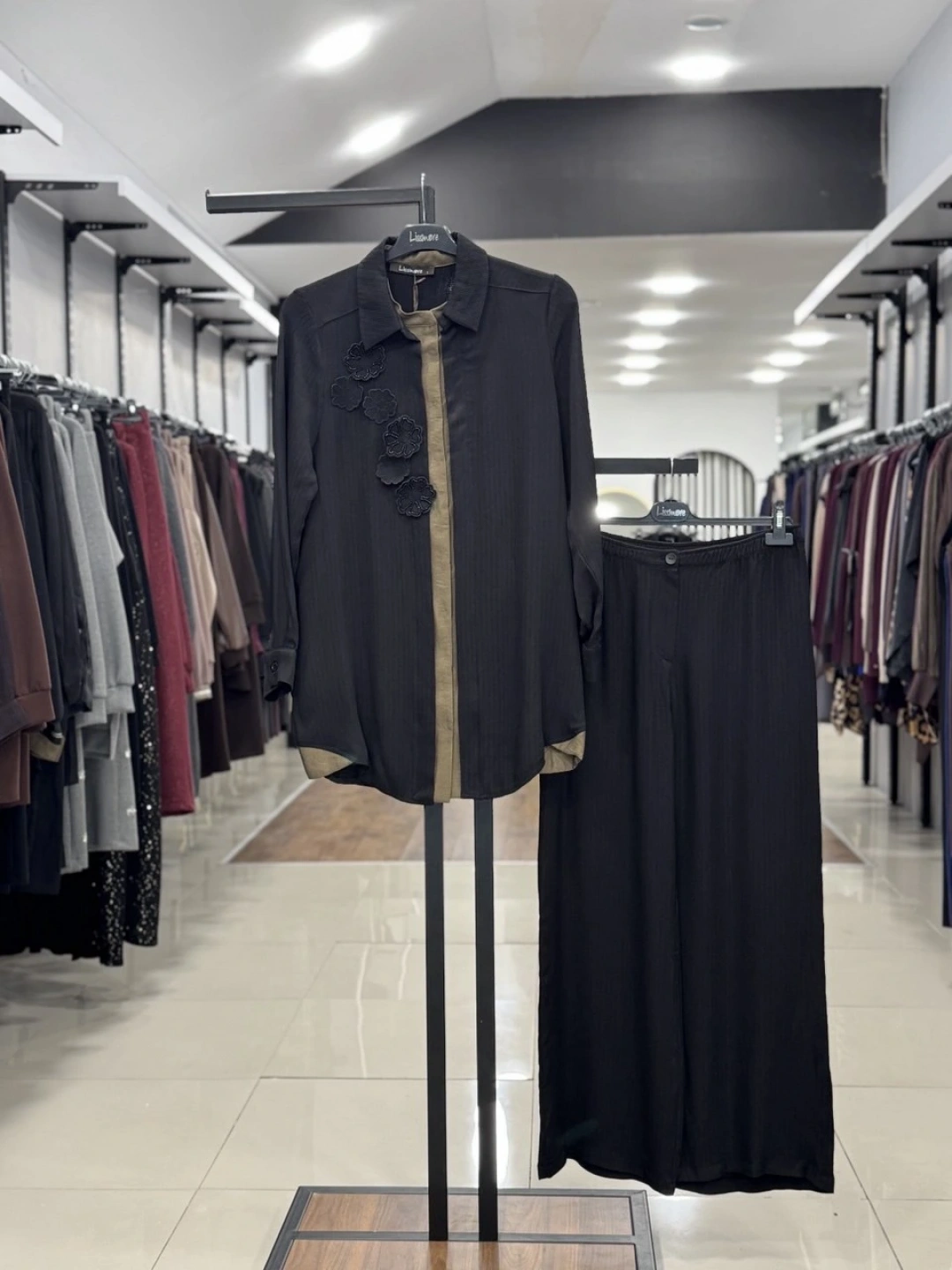 ÖNÜ İÇTEN ÇITÇIT DETAYLI PANTOLONLU RAHAT İKİLİ TAKIM - Siyah