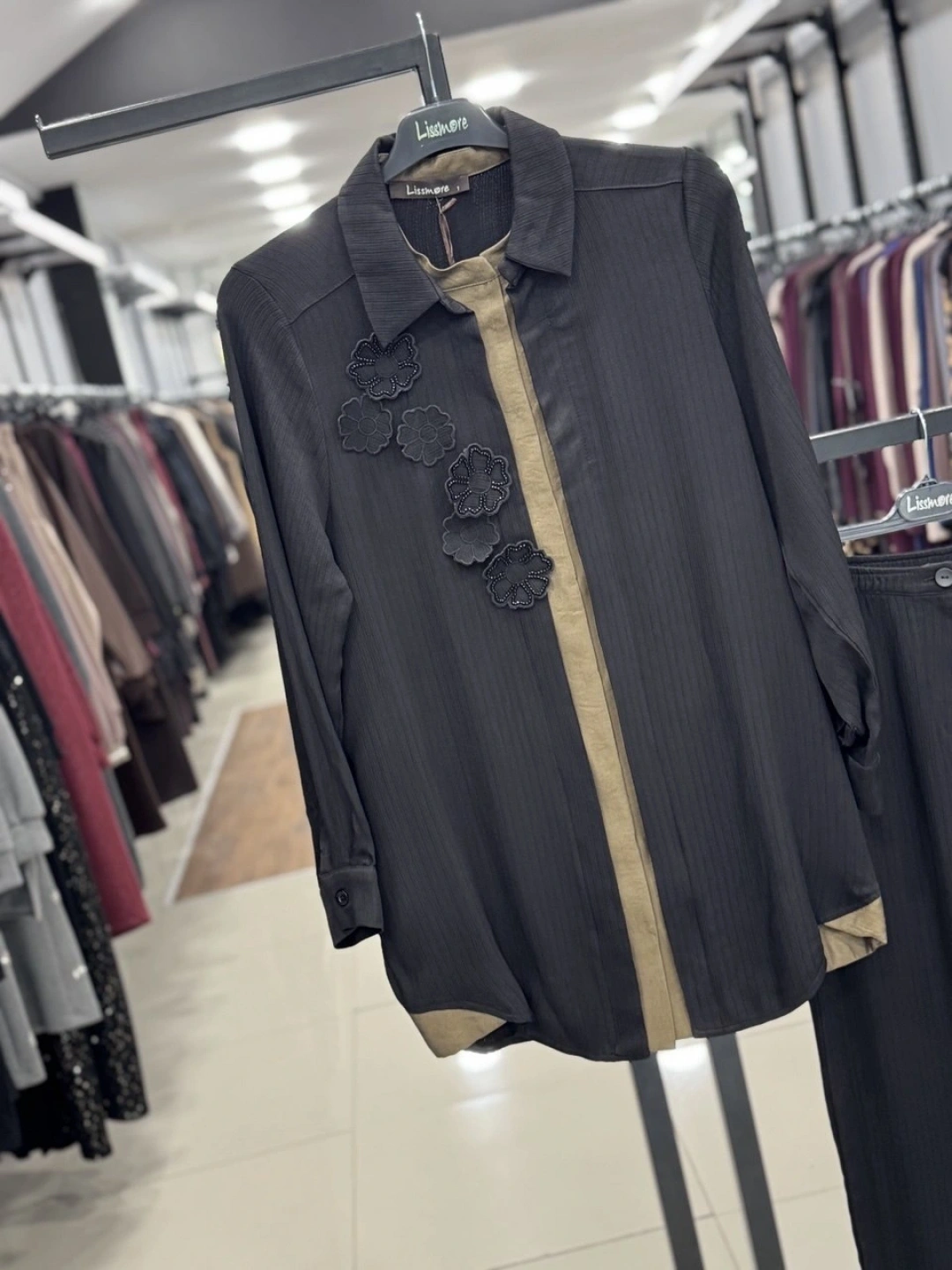 KABARTMALI KUMAŞ VE BONCUK İŞLEME DETAYLI PANTOLONLU İKİLİ T - Siyah