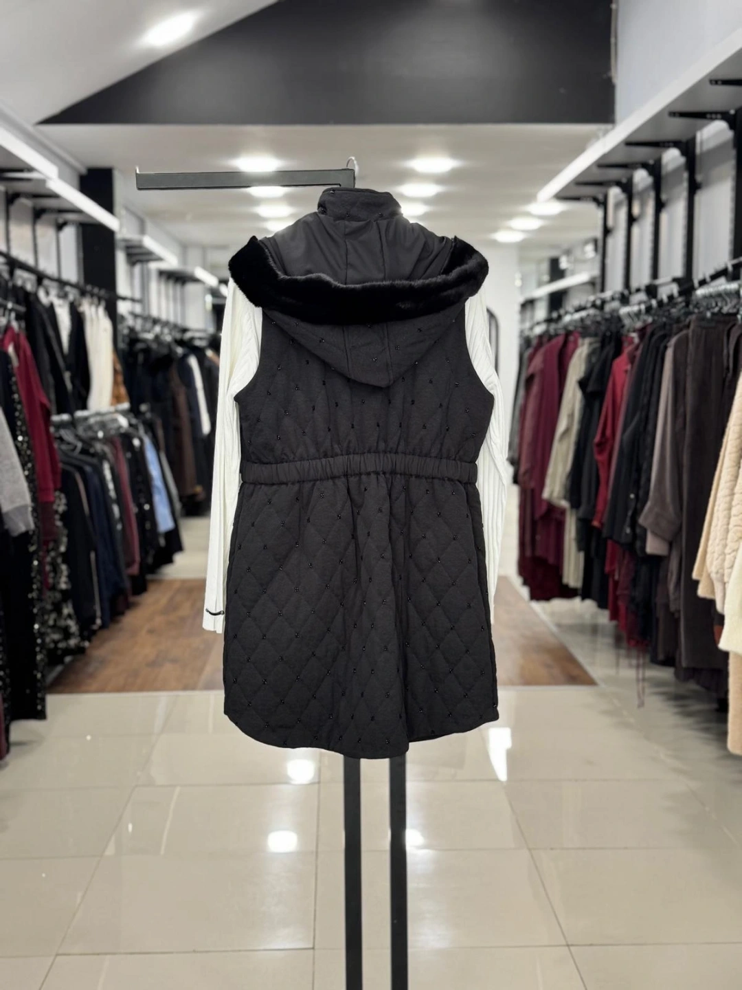 KAPŞONLU KABARTMA KUMAŞLI YELEK - Siyah