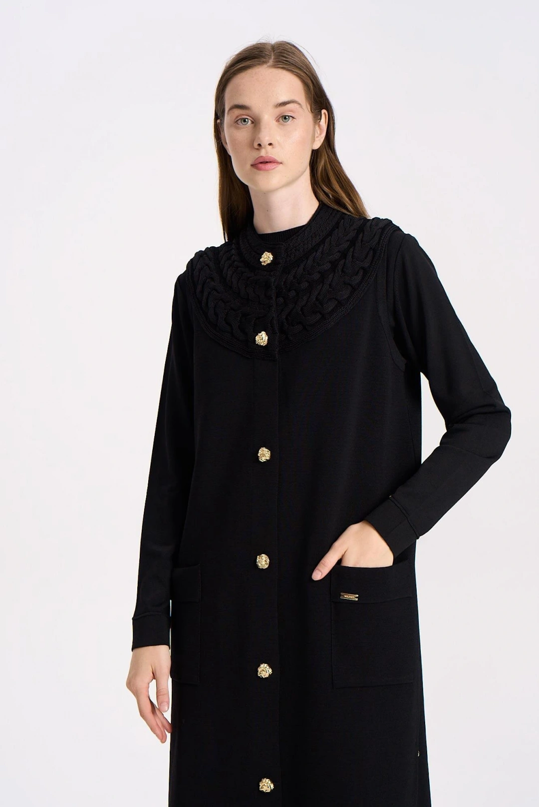 YAKASI SAÇ ÖRGÜLÜ YELEK - Siyah