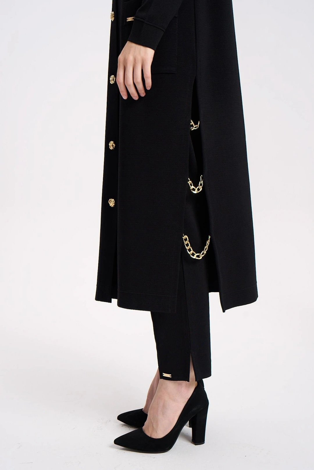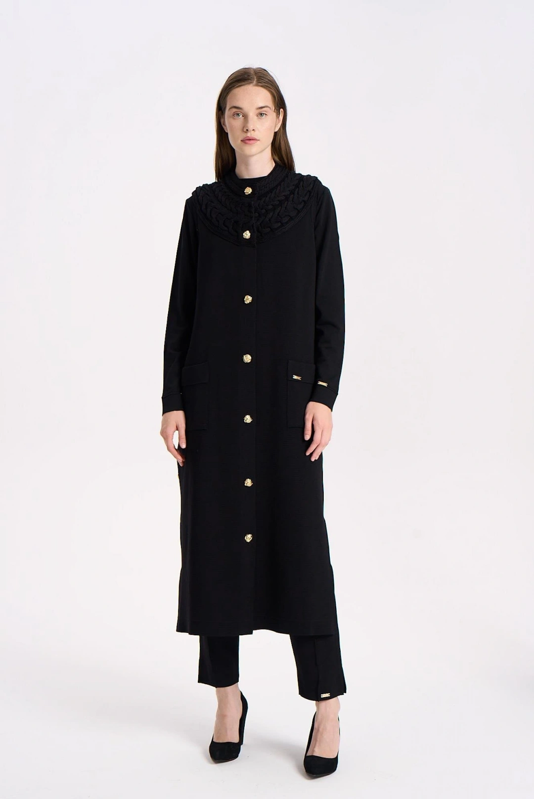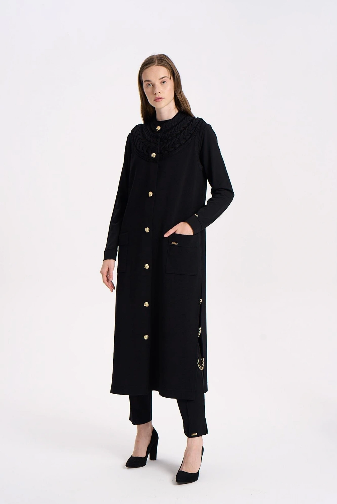KAPŞONLU KABARTMA KUMAŞLI YELEK - Siyah